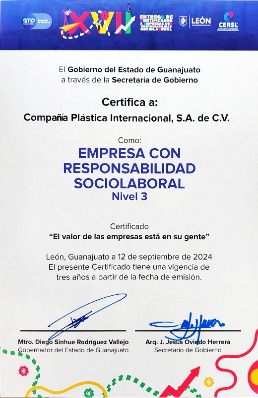 For us, the growth of our family is important, from the personal level, to achieve excellence within the company. Because of this, we remain certified as a COMPANY WITH SOCIO-LABOR RESPONSIBILITY by the Government of Guanajuato. We also belong to the State Advisory Commission for Safety and Health at Work COCOESST.